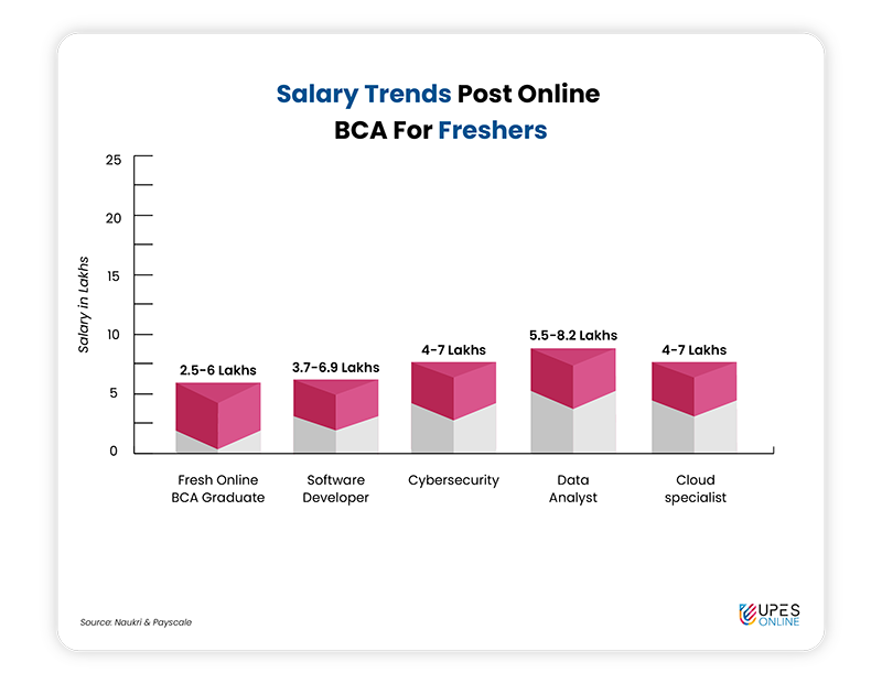 Online BCA specializations in Data Science, Cyber Security, and Cloud Computing offer higher salaries, especially in MNCs and tech startups.